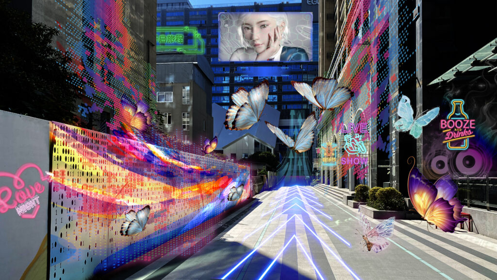 Located in Hangzhou’s bustling commercial core, this project transforms a legendary digital street, rich with nostalgic memories, where the Butterfly Wall and Wishing Tree stand as historic symbols. Shifting from a computer-tech theme to AR and cyber innovation, AR glasses ideally enable this evolution.